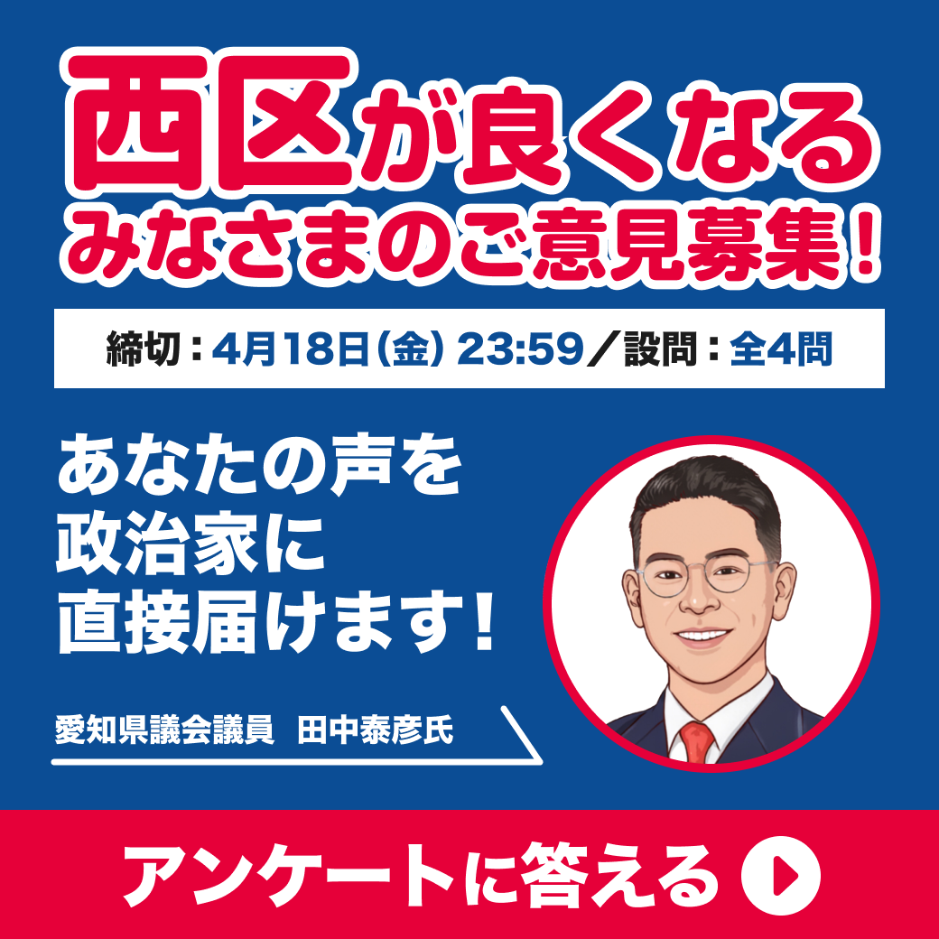 愛知県にお住まいの方々は、日々の暮らしの中でどのようなことを感じているのでしょうか?住みやすさや地域の課題について、株式会社センキョが運営するタウンマッチを通じて、愛知県名古屋市西区に在住の方を対象にアンケートを実施しました。