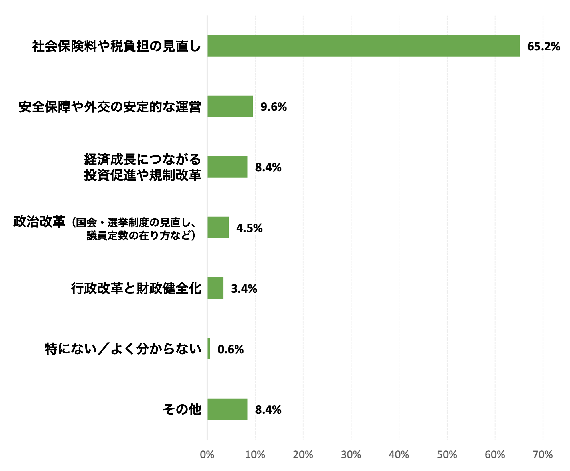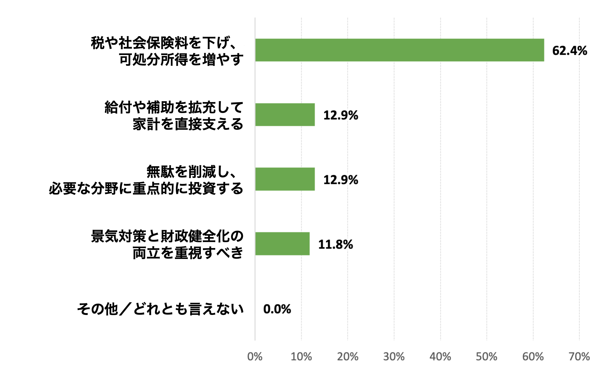 今回の結果から最もはっきりと読み取れるのは、「税や社会保険料を下げ、可処分所得を増やしてほしい」という切実な声が、世代を問わず強く共有されているという点です。物価高や将来不安が続く中で、一時的な給付よりも、恒常的に手取りが増える仕組みを求める声が多数を占めました。これは、日々の暮らしの中で「実感できる改善」を政治に求めている表れだと受け止めています。