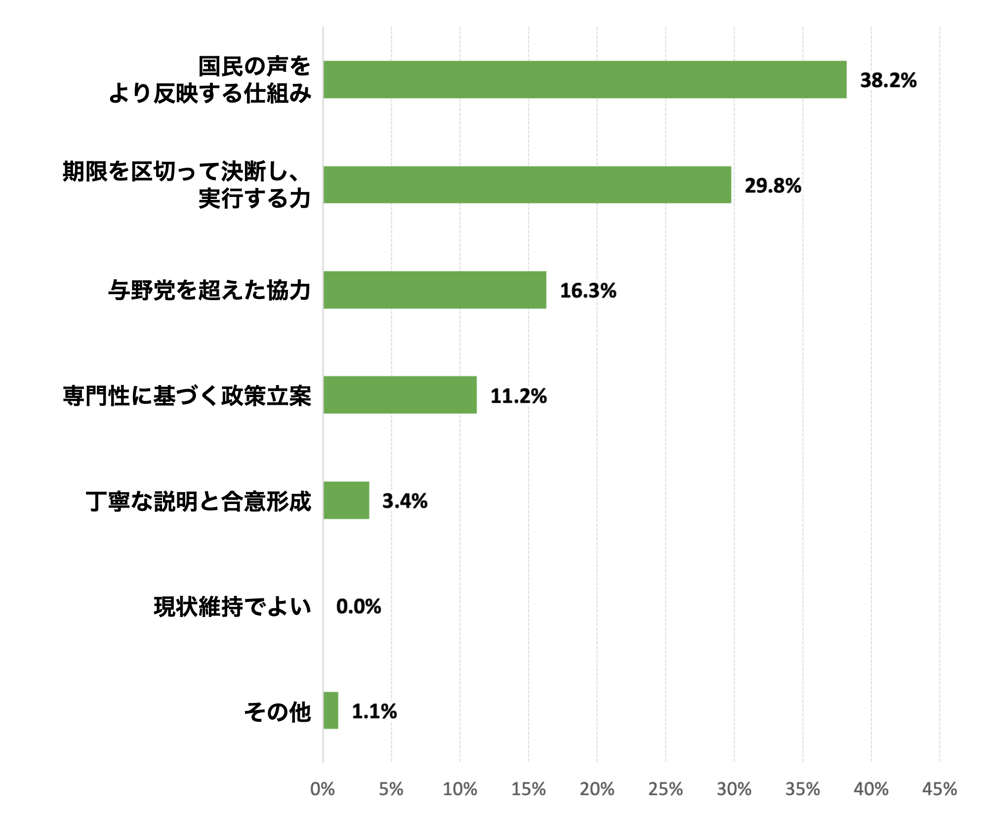 また、政治に求める姿勢としては、「国民の声をより反映する仕組み」と同時に、「期限を区切って決断し、実行する力」が重視されていることも印象的でした。丁寧に話を聞くだけでなく、決めるべきことを決め、結果を出す政治への期待が高まっていると感じています。